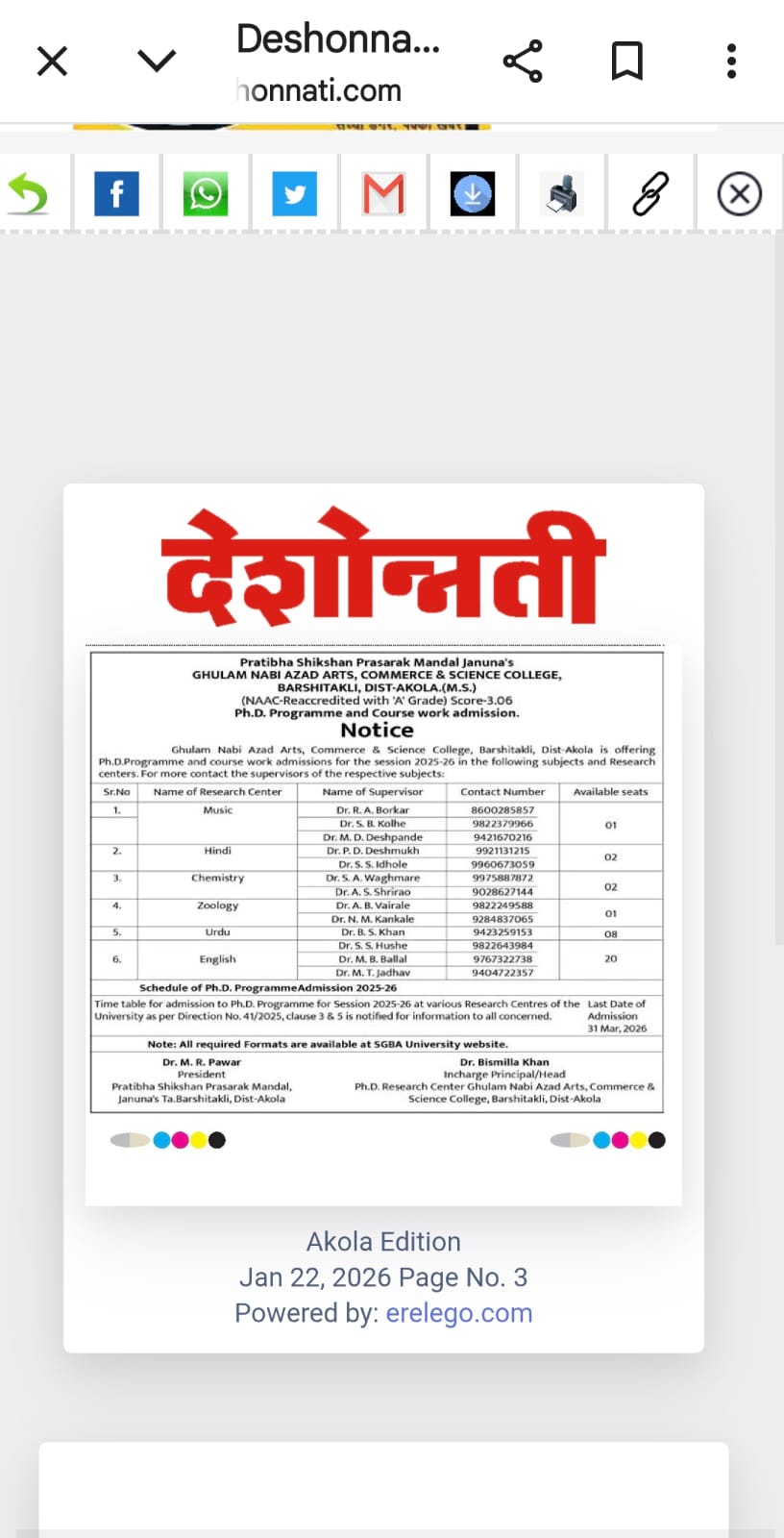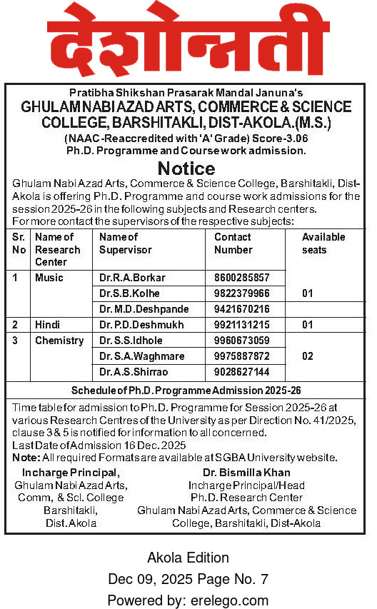 Pratibha Shikshan Prasarak Mandal Januna's Ghulam Nabi Azad Arts, Commerce & Science College, Barshitakli Dist-Akola.